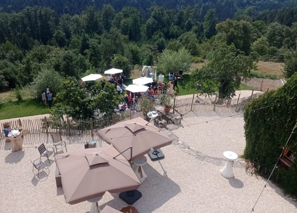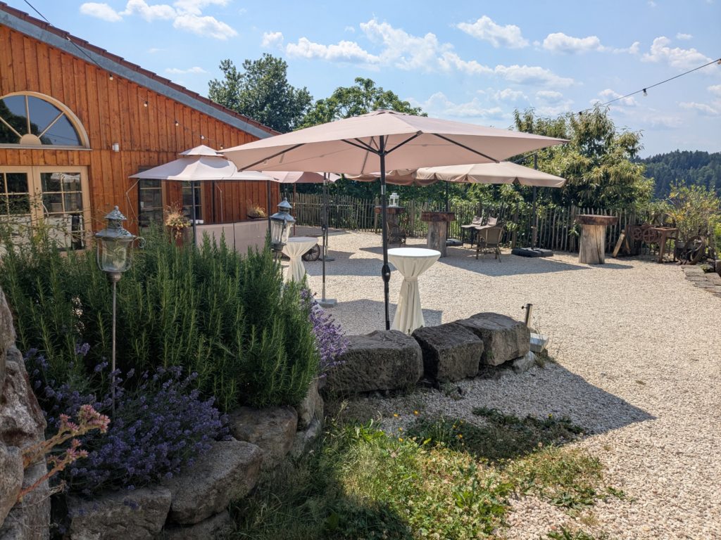 Die großzügige Terrasse mit einem wunderschönen Blick auf den Wald und unsere Weiden bietet bei gutem Wetter zusätzlichen Raum im Freien. Über die Terrasse ist der Festsaal auch barrierefrei zugänglich.